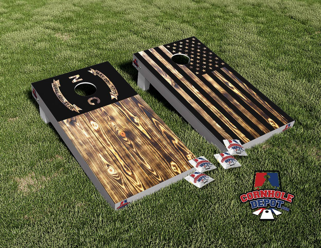 American and North Carolina Flag Dark Wood Cornhole Board Vinyl Wrap Skins Laminated Sticker Set Decal