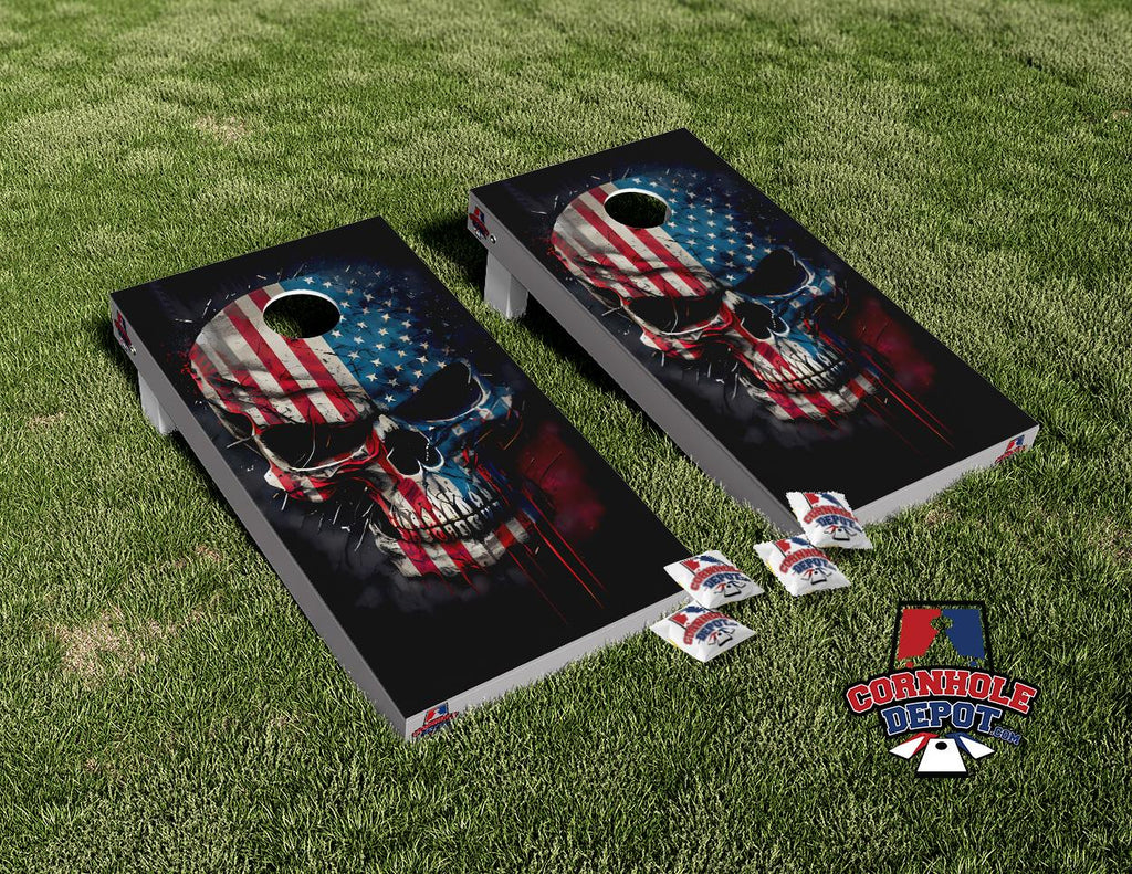 American Flag Skeleton Face Skull Patriotic Cornhole Board Vinyl Wrap Skins Laminated Decal Set
