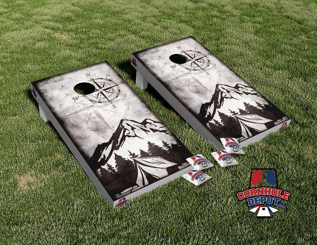 Mountain Campsite Compass Black & White Cornhole Board Vinyl Wrap Skins Laminated Sticker Set Decal